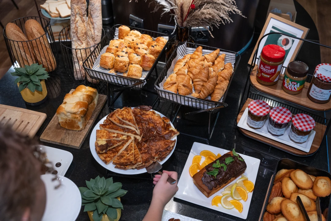 We offer a buffet breakfast featuring a wide selection of fresh and tasty products. You will find hot beverages, fruit juices, breads and pastries, dairy products, hard-boiled or scrambled eggs, cereals, cold cuts, fresh fruit, as well as nuts and dried fruits.